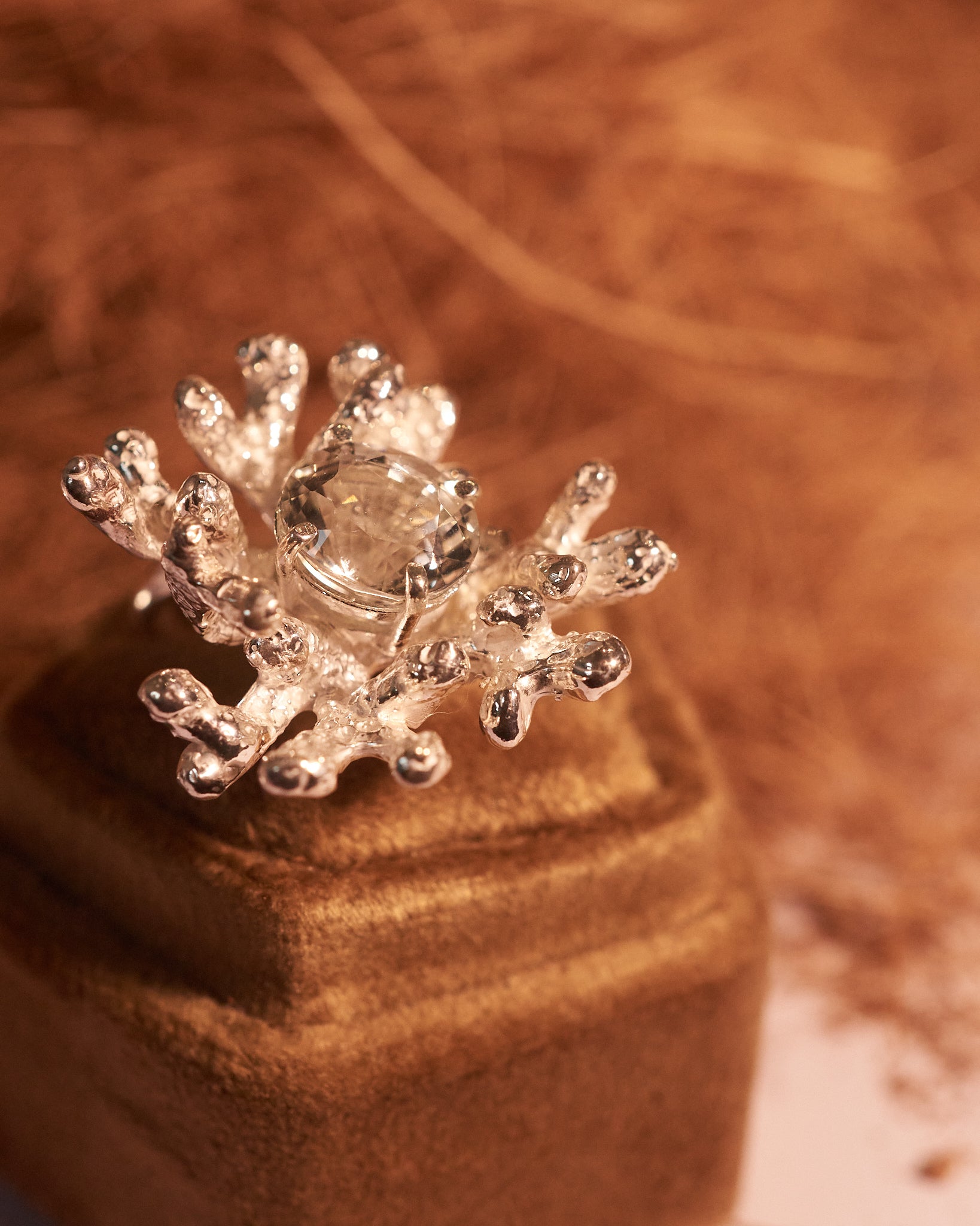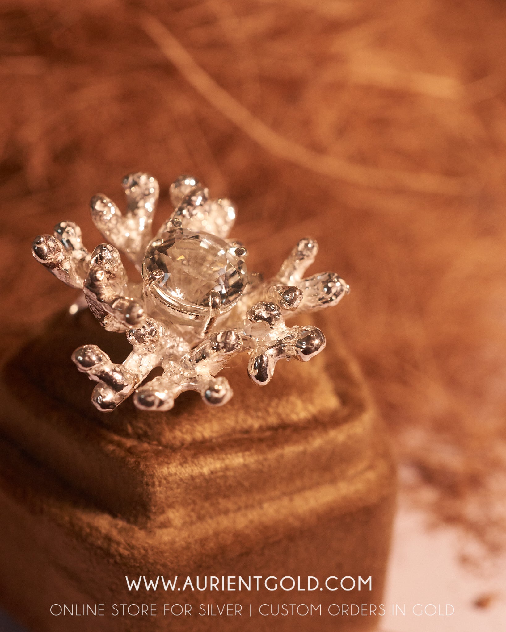 Silver Coral Ring with 11mm x 8mm green Amethyst.